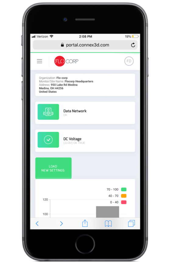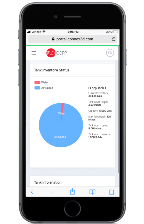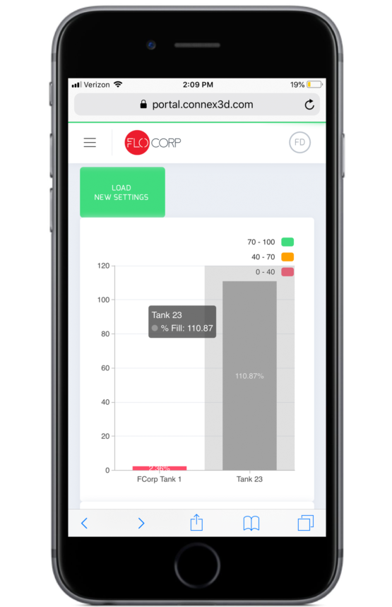 The CONNEX 3D™ Tank Monitoring Online Portal capabilities are unlike anything on the market today. Monitor all of your tanks in one location. With CONNEX 3D™ Online Portal, you are able to easily view your tanks, battery levels, and network status. Receive alarms when your tank levels are too high or too low to avoid costly overflows. With our secure cloud portal, you are able to access your data anywhere in the world. FLO-CORP offers multiple types of level technologies to accurately monitor your tank levels; through the air radar, guided wave radar, or ultrasonic. A CONNEX 3D™ Wireless Monitor is required to access the CONNEX 3D™ Online Portal.